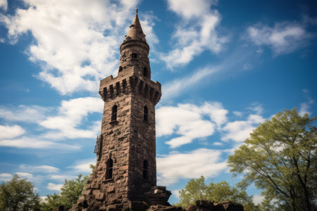 Enchanting Medieval Remnant: Old Stone Tower with Spiky Spire Amidst a Blue Cloudy Sky
