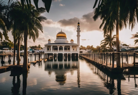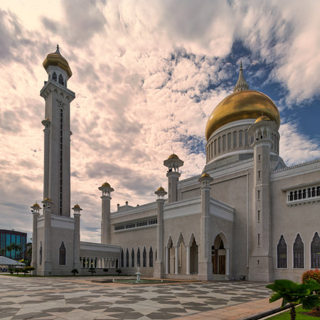 Stunning architecture of Jame Asr Hassanil Bolkiah Mosque in Bandar Seri Begawan, Brunei. The golden dome glistens under a colorful sky, creating a peaceful atmosphere