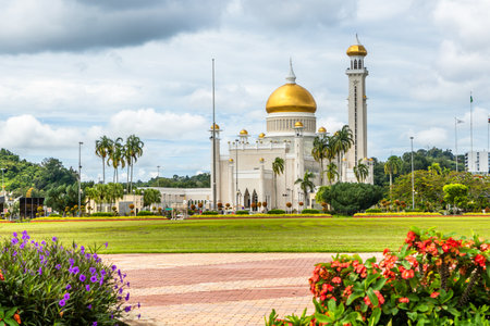 Beautiful View of Jame Asr Hassanil Bolkiah Mosque with Green Plants in Front - Bandar Seri Begawan, Brunei, Southeast Asia