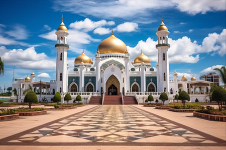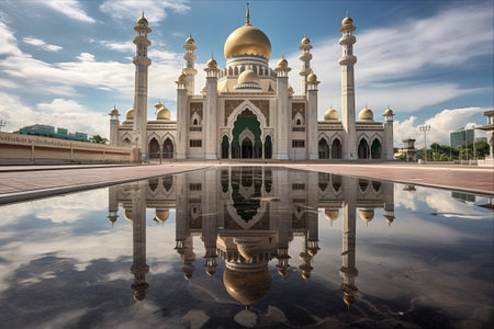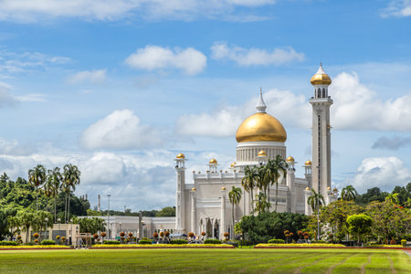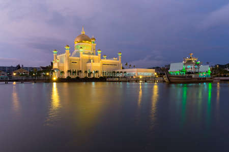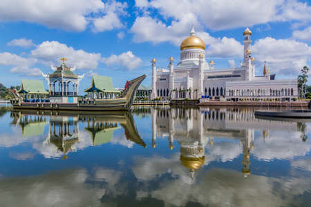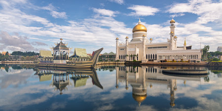 Majestic and ornate, Omar Ali Saifuddien Mosque, and Royal Barge reflects i tranquil waters of Bandar Seri Begawan, Brunei. Golden dome and intricate details offer a breathtaking panoramic view