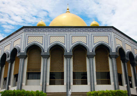 Beautiful Masjid At-Taqwa mosque with its Golden dome at the pond. Miri city, Borneo, Sarawak, Malaysia
