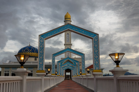 Image of omar ali saifuddien mosque bandar seri begawan brunei view from pedestrian bridge leading to it with reflection in water. Facus on mosque. Captured before heavy rain under gloomy condition.