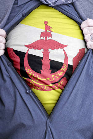 A Bruneian businessman rips open his shirt and shows how patriotic he is by revealing his countries flag beneath printed on a t-shirt