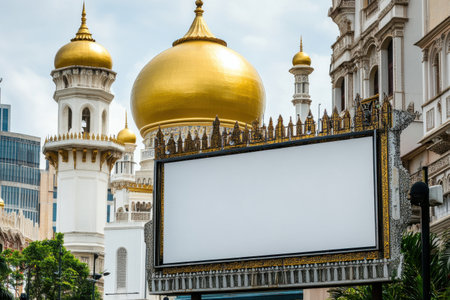 A large white billboard sits in front of a building with gold domes. The billboard is empty, but the architecture of the building and the surrounding area gives off a sense of grandeur and importance
