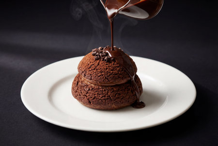 Thick hot chocolate sauce flows from a jug onto a rich choux pastry dessert topped with curls on a white plate against a black background with rising steam.