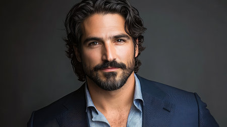 Studio portrait of handsome man wearing formal blue shirt, posing on black background