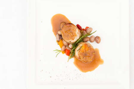 Rabbit stuffed with wild mushrooms, served with sauted haricot beans. French cuisine. Horizontal. Top view
