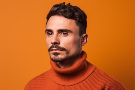 Portrait of a serious young Caucasian man with wavy brown hair, wearing a white crew neck shirt, dramatically framed against a pure black background using golden backlighting.