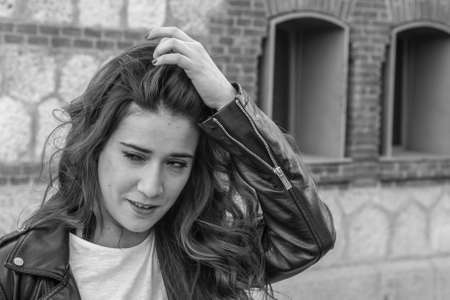 Outdoor close up portrait of pretty teenage girl on the city street