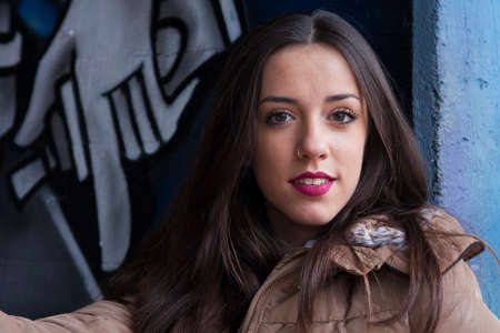 Portrait of young beautiful woman against graffiti wall. Outdoors. Urban concept.