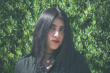 Close up portrait of a girl with long black hair outdoor