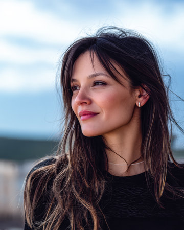 A stunning portrait of a young woman with flowing hair, reflecting natural light. Her serene expression captures a moment of confidence and authenticity.