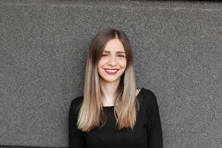 A very beautiful and cheerful girl stands on the street with long, luxurious hair