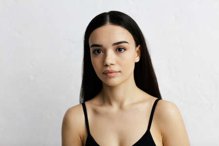 Portrait of beautiful smiling Hispanic latino girl woman with dark brown eyes long dark hair in white shirt posing in studio on dark black background looking in camera