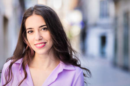 beautiful hispanic independent young woman lifestyle urban portrait. Lavender streetwear stylish looking at camera. Real people