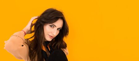 Cacucasian brunette model posing for the camera on yellow background, panorama