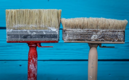 Used paint brush. Blue brush with a red tip in white paint. Macro photo. Repair brush in hand. Fibers copy space