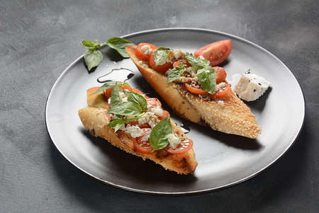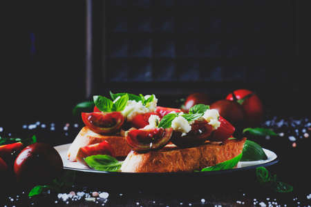 Crispy bruschetta with red and brown cherry tomatoes, feta cheese and green basil on the plate, selective focus