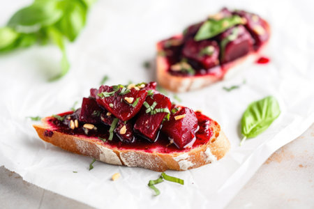 half eaten beetroot bruschetta on a paper napkin, created with generative ai