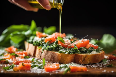 sprinkling fresh oregano leaves on bruschetta with a hand, created with generative ai