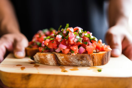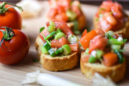 Bruschetta with fresh vegetables on wooden board at a casual dining setting