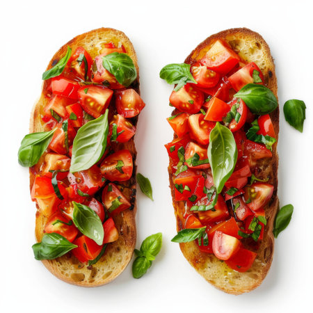 Two bread slices topped with tomatoes and basil in traditional Italian appetizer