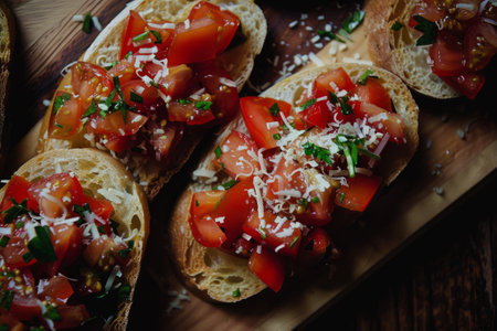 Bruschetta with cherry tomato, sauce and parmesan cheese. Generative AI illustration