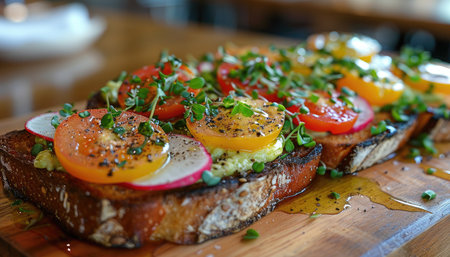 A creative shot of toast with colorful toppings like mashed avocado, cherry tomatoes, and herbs, placed on a stylish wooden serving board in a trendy caf.
