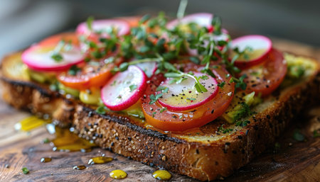 Healthy sandwich with avocado, radish, tomatoes and microgreens