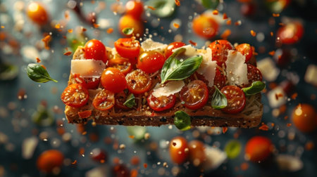 overhead view of bruschetta with zaatar and roasted cherry tomatoes, created with generative ai