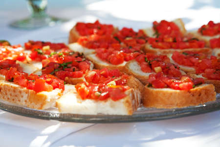 Fresh homemade crispy Italian antipasto bruschetta topped with tomato, garlic and basil