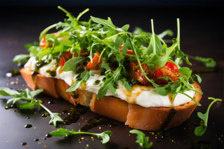 macro shot of bruschetta with plenty of arugula, pepper, and sea salt, created with generative ai
