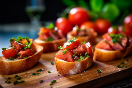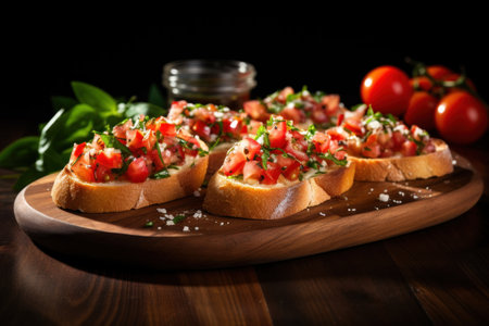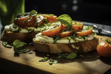 Generative AI : Tomato pesto bruschetta crostini with fresh basil on serving board Close up