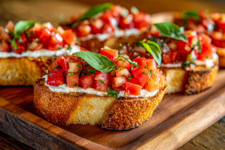Crisp golden-brown bread rounds layered with juicy diced tomatoes, fragrant herbs, smooth cheese, and vibrant basil leaves, presented on a rustic wooden platter for an in