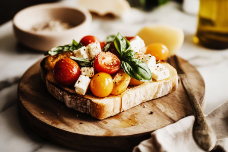Enjoy a delicious breakfast featuring vibrant tomatoes, fresh basil, and creamy feta cheese on toasted rustic bread. Perfect for a nutritious morning meal.