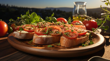 A vibrant plate of bruschetta featuring ripe tomatoes, fresh basil, and herbs served on toasted bread. Perfect appetizer for gatherings or a light meal.