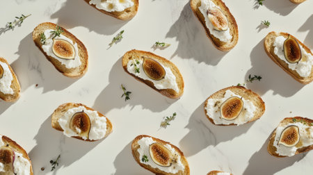 Artisan crostini topped with creamy ricotta and fresh fig slices, elegantly arranged on a marble surface. Delicate thyme sprigs add a touch of greenery, enhancing the gourmet presentation