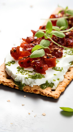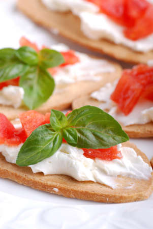 Crispbread with cream cheese, dried tomatoes and basil.