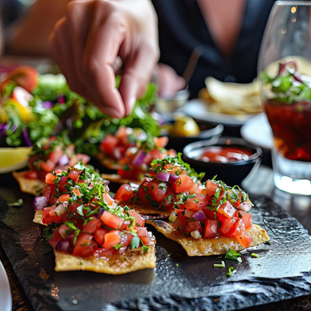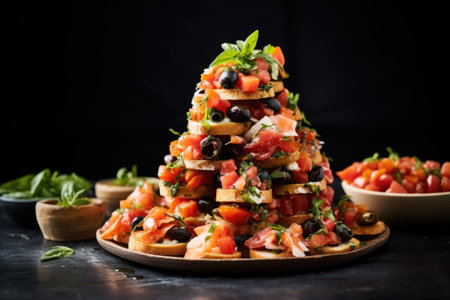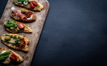 A delightful array of bruschetta featuring vibrant tomatoes and herbs on toasted bread, perfect for events or gatherings. A feast for the senses showcasing colorful ingredients.