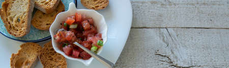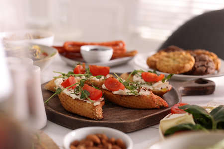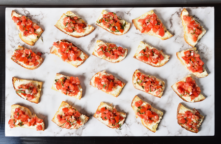 Preparing tasty tomato Italian appetizers - bruschetta, on slices of toasted baguette, close up view