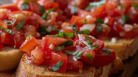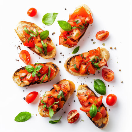 Enjoy a top view of crispy bruschetta slices topped with fresh tomatoes and basil. Perfect for appetizers or a light snack, this dish captures vibrant flavors and textures.
