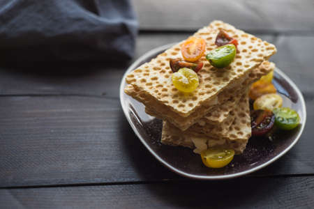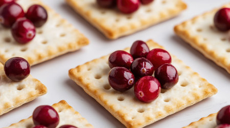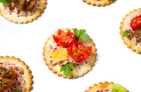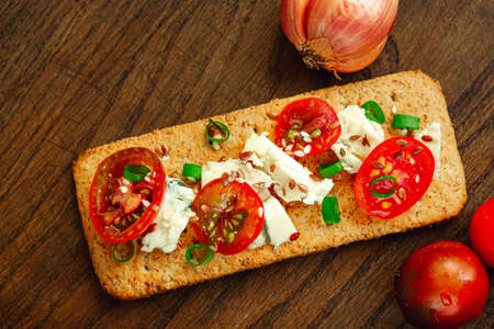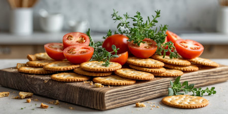 Crispy cracker with herbs and cherries. Still life of eating cookies with sauce and herbs and tomatoes.