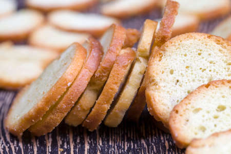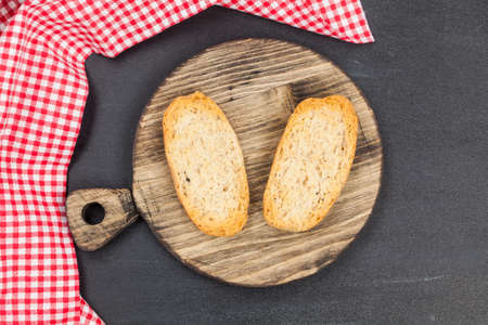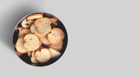 A closeup view of dry bread slices under the lights isolated on a grey background.
