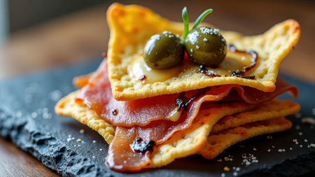 vegetarian platter with olives cheese and multigrain crackers, concept of healthy meal starters