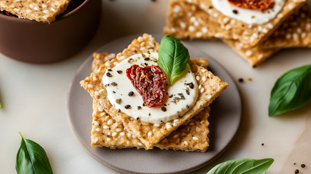 crackers with goat cheese, sun-dried tomatoes and basil