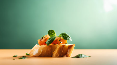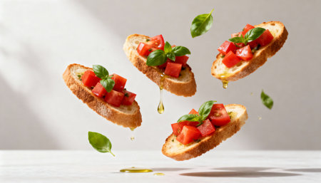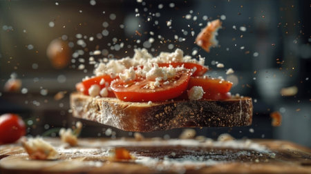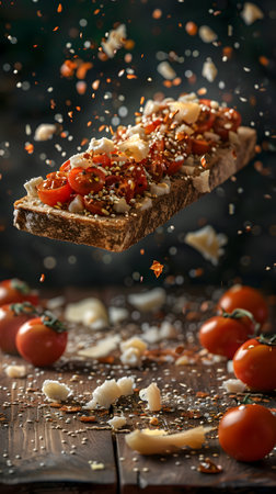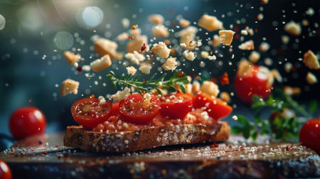 Gourmet bruschetta with fresh tomatoes and cheese mid-air, a culinary delight. Download this flavorful AI generated masterpiece