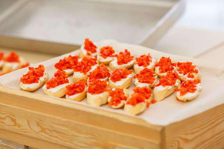 Close up of a stack of bruschetta with red caviar