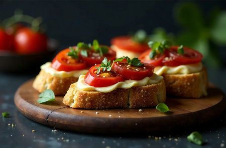 Vibrant slices of toasted bread topped with juicy tomatoes, earthy mushrooms, fragrant herbs, and melted cheese, arranged invitingly on a textured wooden surface.