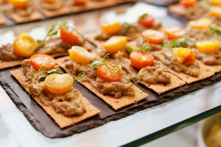 Crisp bran breads with eggplant mash and cherry tomatoes on restaurant table