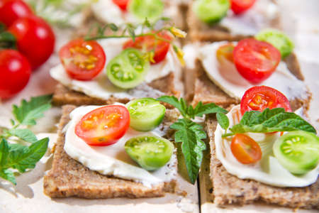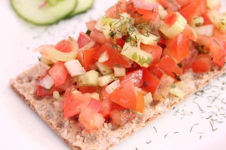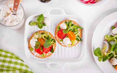 Round crispbread toast with greens and vegetables. Healthy food concept.